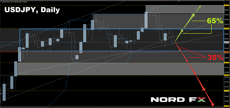 - USD/JPY। আগের সপ্তাহের পরিস্থিতির নিরীখে, এই জুটির, 110.00-র উচ্চতায় পৌঁছে, দক্ষিণ দিকে ঘুরে যাবার কথা ছিল। যদিও, এই জুটি সেটা করেছিল, খালি 25 পয়েন্ট মতো বাকি রেখে। আর তারপর সবকিছুই হুবহু পূর্বাভাস অনুসারেই হয়েছিল: 109.00-এর অবলম্বনে পতন, তারপর একটু থামা, এবং পরবর্তী অবলম্বন অঞ্চল 108.50-র অঞ্চলে পতন। তার থেকে খুব একটা দূরে, 108.55-র স্তরে, এই জুটি তার কারবার সেশন শেষ করেনি;