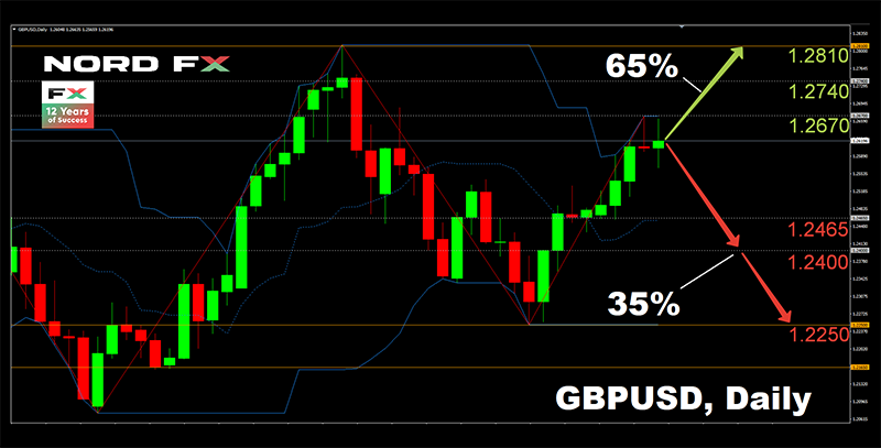 इसके विपरीत, यूरो को बेहतर लगता है, महामारी विज्ञान स्थिति और EU की सक्षम मौद्रिक एवं राजकोषीय नीति के सुधार के लिए धन्यवाद। यूरोप के लिए समर्थन भी तेजी से मजबूत होने वाले युआन और, विडंबना यह है कि US राष्ट्रपति डोनाल्ड ट्रम्प द्वारा प्रदान किया जाता है। अधिक सटीक रूप से, उनकी गिरती हुई रेटिंग, जिसके कारण वह अब चीन के साथ ट्रेड वॉर तक नहीं है। और यदि डेमोक्रेट जो बिडेन नए राष्ट्रपति बनते हैं, तो बीजिंग के प्रति वाशिंगटन की नीति नाटकीय रूप से बदल सकती है, जो चीनी के और आगे बढ़ने का नेतृत्व करेंगे, परिणामस्वरूप, यूरोपीय अर्थव्यवस्थाएँ बढ़ेंगी; - GBP/USD. पूर्वानुमान के अंतिम अंक में, हमने सोचा कि क्या पाउंड की वृद्धि को एक अस्थायी सुधार माना जाता है या रुझान में एक महत्वपूर्ण बदलाव। संकेतकों का विशाल बहुमत ने, आरेखीय विश्लेषण के साथ, युग्म के लिए आगे वृद्धि की भविष्यवाणी की। कुल 50% विशेषज्ञ इसके उत्तर की ओर गति के पक्ष में बोले, जिसमें 30% एक लिमिटर के रूप में 1.2680 के एक प्रतिरोध की ओर संकेत करते हैं। और वे सही थे: सप्ताह की ऊँचाई 1.2670 दर्ज की गई, जिसके बाद मामूली उछाल आया और 1.2625 पर समाप्त हुई।