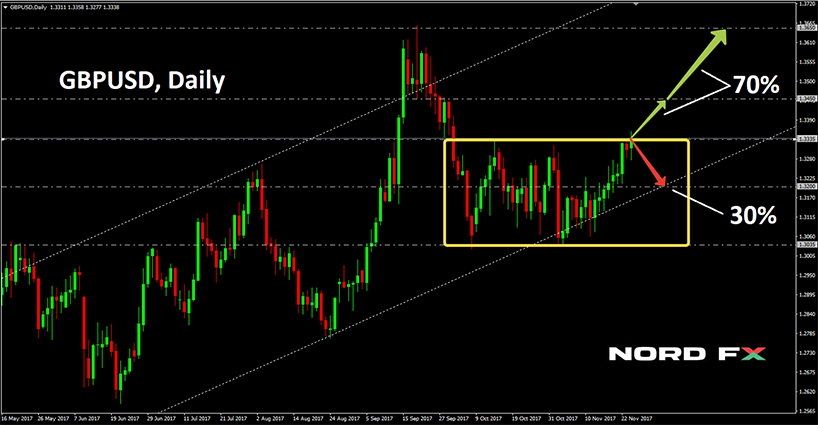 This scenario was implemented with 100% accuracy: until the middle of the week, the pair had struggled to stay close to the center of the medium-term corridor, using its Pivot Point as support, and then rushed up, reaching the October maximum at 1.3338 on Friday;