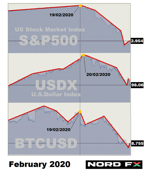 The euro and the yen have been rising against the dollar all week. And if Bitcoin is a hedge asset as well, its quotes would also have to go up. But it was exactly the opposite. The dollar was flying down, and Bitcoin, along with top altcoins, including Ethereum (ETH/USD), Litecoin (LTC/USD) and Ripple (XRP/USD), were flying down even faster. Having fixed a monthly low of $8.455 on February 28, the BTC/USD pair lost almost 12.5% of its value over the week. The total capitalization of the crypto market decreased by 15%, and the Crypto Fear & Greed Index, froze in a state of "fear", having fallen to the level of 40.