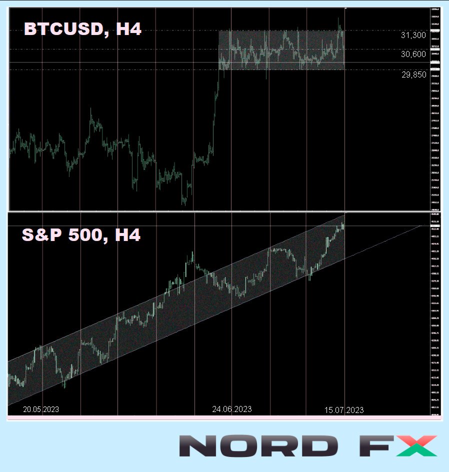 • After the release of impressive consumer inflation data in the US last week, the markets became confident in the Fed's imminent abandonment of monetary restriction and a turn towards lowering the key rate. The dollar responded to this with a sharp fall, and risky financial instruments - with growth. The S&P500, Dow Jones, and Nasdaq Composite stock indices went up, but not bitcoin. The BTC/USD pair continued to move sideways along the Pivot Point $30,600, trapped in a narrow range. It seems as if it has completely forgotten about its direct correlation with stocks and its inverse correlation with the dollar. On Thursday, July 13, after the release of the American PPI, bitcoin still tried to break through to the north, but unsuccessfully: the very next day it returned within the limits of the sideways channel.
