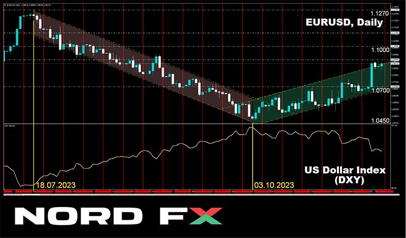 In reality, a 0.1% drop in inflation is not that significant. However, the market's strong reaction demonstrated how overbought the dollar was. As analysts at ING (Internationale Nederlanden Groep) write, a powerful bullish trend in Q3 this year led to a 4.9% increase in the dollar. Keeping the dollar strong was easy due to the high interest rates and increased yields of U.S. Treasury bonds.