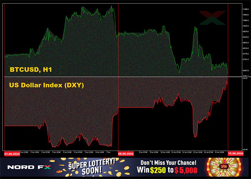 ● In the absence of independent drivers, the crypto market has recently followed the dollar, which in turn follows the Fed, which follows the macro statistics from the USA. BTC/USD is like scales, with the main cryptocurrency on one side and the US dollar on the other. The dollar became heavier – bitcoin became lighter, and vice versa. On Friday, 7 June, strong statistics on the US labour market were released – the dollar became heavier, bitcoin lighter. On Wednesday, 12 June, it turned out that inflation in the USA was decreasing – the dollar weakened, bitcoin became heavier. And in the evening, the Fed calmed the markets regarding the interest rate – and the scales swung back. Just look at the BTC/USD and Dollar Index (DXY) charts – the inverse correlation leaves no doubt.