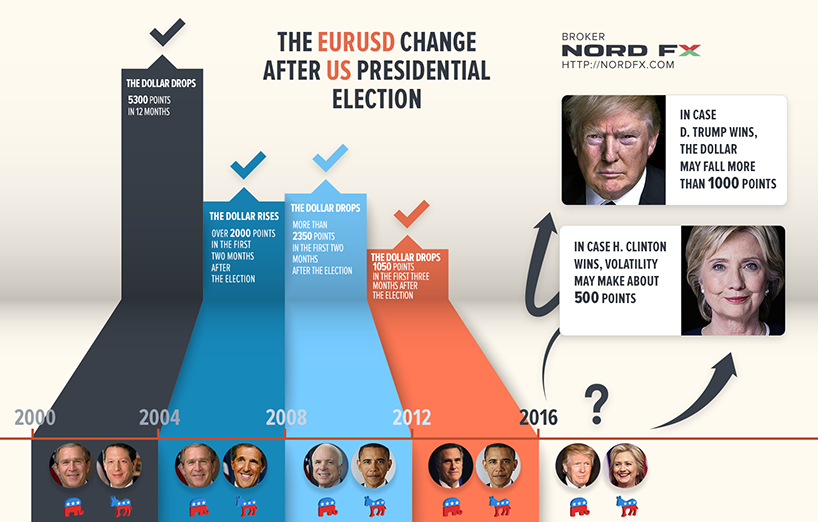 JP Morgan analysts believe that the dollar will weaken regardless of the US electoral outcome. In the event of Trump's victory, NordFX analysts forecast that its fall may reach 10-15%. If, on the other hand, Hillary Clinton wins, the fluctuation of all indicators may reach ± 5%.