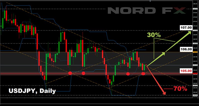 สำหรับนักวิเคราะห์ 30% และการวิเคราะห์กราฟนั้นคาดการณ์ว่า ดอลลาร์จะแข็งค่าขึ้น ทำให้คู่ USD/JPY สามารถตัดขึ้นผ่านระดับ 105.00 และขยับขึ้นมายังแนวต้านที่ 106.00 จากนั้นที่ 106.40 และท้ายที่สุดขึ้นไปยังระดับ 107.20