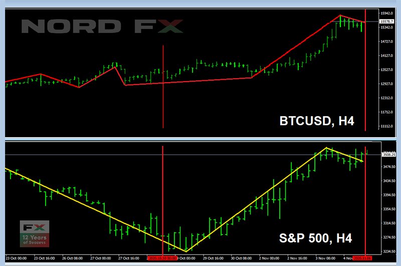 และตอนนี้ก็มาถึงข่าวหลักที่เราให้สัญญาไว้: บิทคอยน์ทะยานขึ้นไปถึงระดับ $15.880 เมื่อคืนวันที่ 5-6 พฤศจิกายน จึงขึ้นมา 17.2% ตลอดทั้งสัปดาห์ ทั้งนี้ ตั้งแต่ช่วงปลายเดือนตุลาคม ราคาบิทคอยน์ทะยานขึ้นมาโดยมีความสัมพันธ์กับดัชนีหลักทรัพย์ ได้แก่ Dow Jones, Nasdaq and Standard & Poor's 500 และทองคำ ซึ่งไม่น่าประหลาดใจเพราะว่าในช่วงการแพร่ระบาด ธนาคารเฟดสหรัฐฯ ได้พิมพ์ธนบัตรจำนวนมหาศาล และนักลงทุนรายใหญ่หลายคนกังวลเกี่ยวกับปัญหาเงินเฟ้อ จึงเพิ่มบิทคอยน์เข้ามาในพอร์ตในฐานะสินทรัพย์ปลอดภัย ดังนั้น ราคา BTC/USD จึงทะยานขึ้นมาในช่วงครึ่งหลังของสัปดาห์ และก็มีความเกี่ยวข้องกับชัยชนะของ นายโจ ไบเดน ในศึกการเลือกตั้งประธานาธิบดีสหรัฐฯ ซึ่งทำให้ดอลลาร์อ่อนค่าลงโดยรวม และมีเงินทุนไหลเข้าสู่สินทรัพย์ปลอดภัยที่มีความเสี่ยง