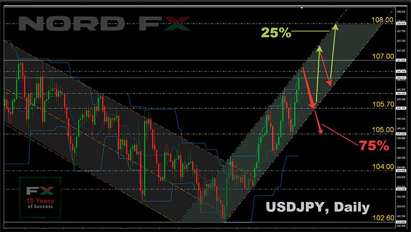 ส่วนผู้เชี่ยวชาญ 30% ที่เหลือเชื่อว่า ราคาจะตัดผ่านกรอบด้านล่างของช่องที่ 1.3860 จากนั้นไปที่แนวรับบริเวณ 1.3800 และจะไปยังโซน 1.3600-1.3760 ทั้งนี้ เมื่อปรับจากการวิเคราะห์รายสัปดาห์เป็นรายเดือน จำนวนผู้สนับสนุนเทรนด์ตลาดหมีเพิ่มเป็น 65% - USD/JPY เทรนด์ขาลงที่กินเวลาหลายเดือนได้หยุดลงเมื่อวันที่ 6 มกราคม และราคาก็เริ่มขึ้นมายังทิศเหนือ โดยขยับเข้าสู่กรอบขาขึ้น จากการวิเคราะห์กราฟบน D1 คู่ USD/JPY ขยับเกือบถึงกรอบด้านบนแล้วตอนนี้ ซึ่งเป็นโซน 106.70-107.00 และคาดว่าในเร็ว ๆ นี้ จะตีกลับมายังทิศใต้อีกครั้ง สถานการณ์นี้สนับสนุนโดยสัญญาณจากออสซิลเลเตอร์ 25% ที่ชี้ว่า ราคาอยู่ในโซน overbought ชัดเจนว่า ออสซิลเลเตอร์ 75% ที่เหลือ และอินดิเคเตอร์ 100% บนกรอบเวลาทั้งสองให้สัญญาณยังเป็นสีเขียวในตอนนี้