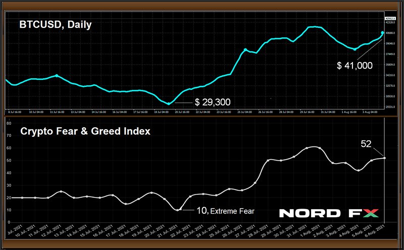 หลังจากราคาดีดตัวจากระดับต่ำสุดที่ $29,300 เมื่อวันที่ 20 กรกฎาคม ราคาคู่ BTC/USD ขยับขึ้นมาอีกประมาณ 40% และซื้อขายอยู่ในโซน $41,000-42,500 ณ ขณะที่เขียนบทวิเคราะห์ฉบับนี้ มูลค่ารวมในตลาดคริปโตเติบโตขึ้น 40% เช่นเดียวกันในช่วงเวลานี้: จาก $1.19 เป็น $1.67 ล้านล้านดอลลาร์ ในส่วนดัชนี Crypto Fear & Greed Index ในที่สุด ดัชนีได้ขยับจากโซนน่ากลัวอย่างยิ่งสู่โซนตรงกลาง และขึ้นมาจาก 10 จุด เป็น 52 จุด